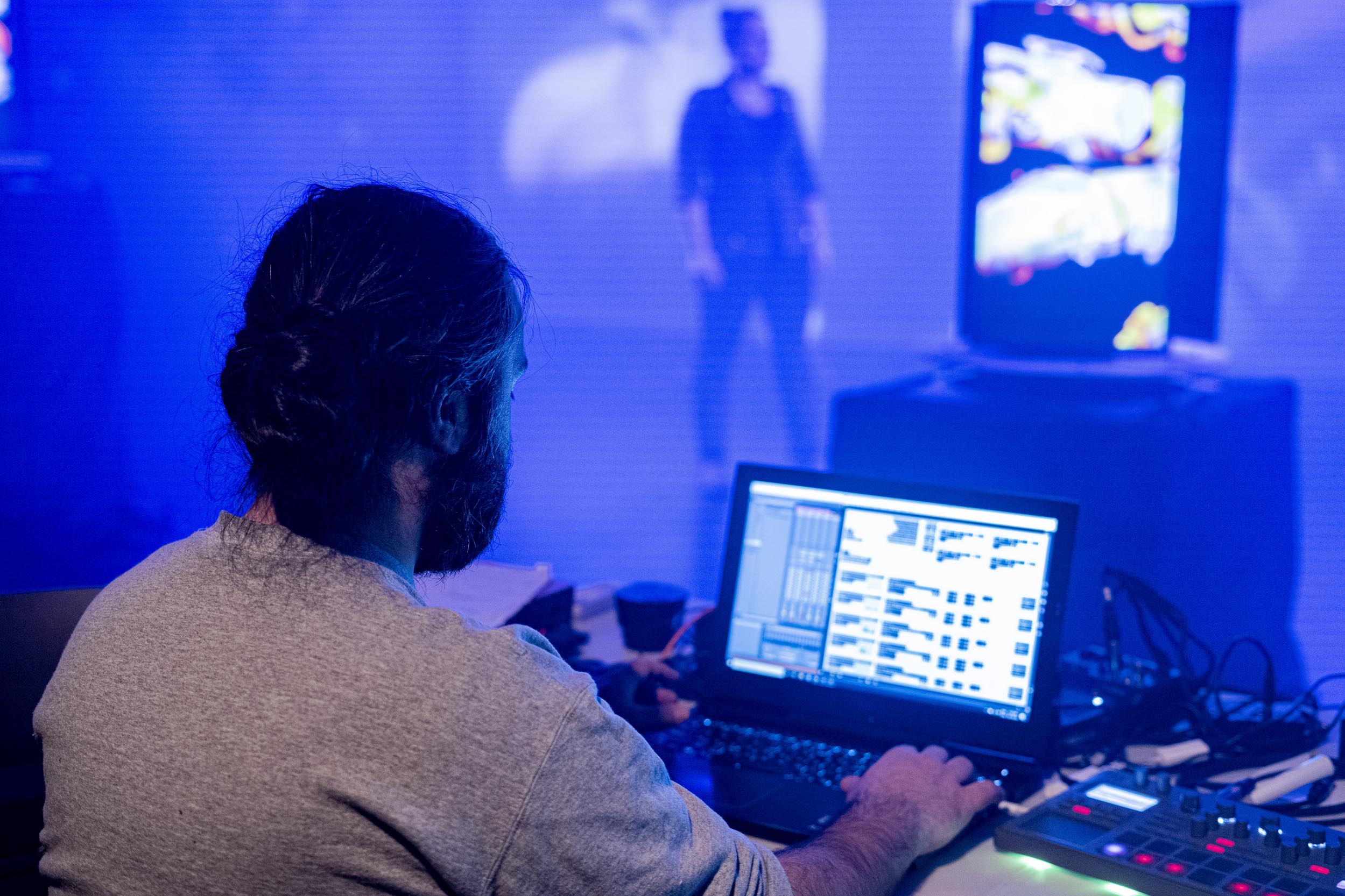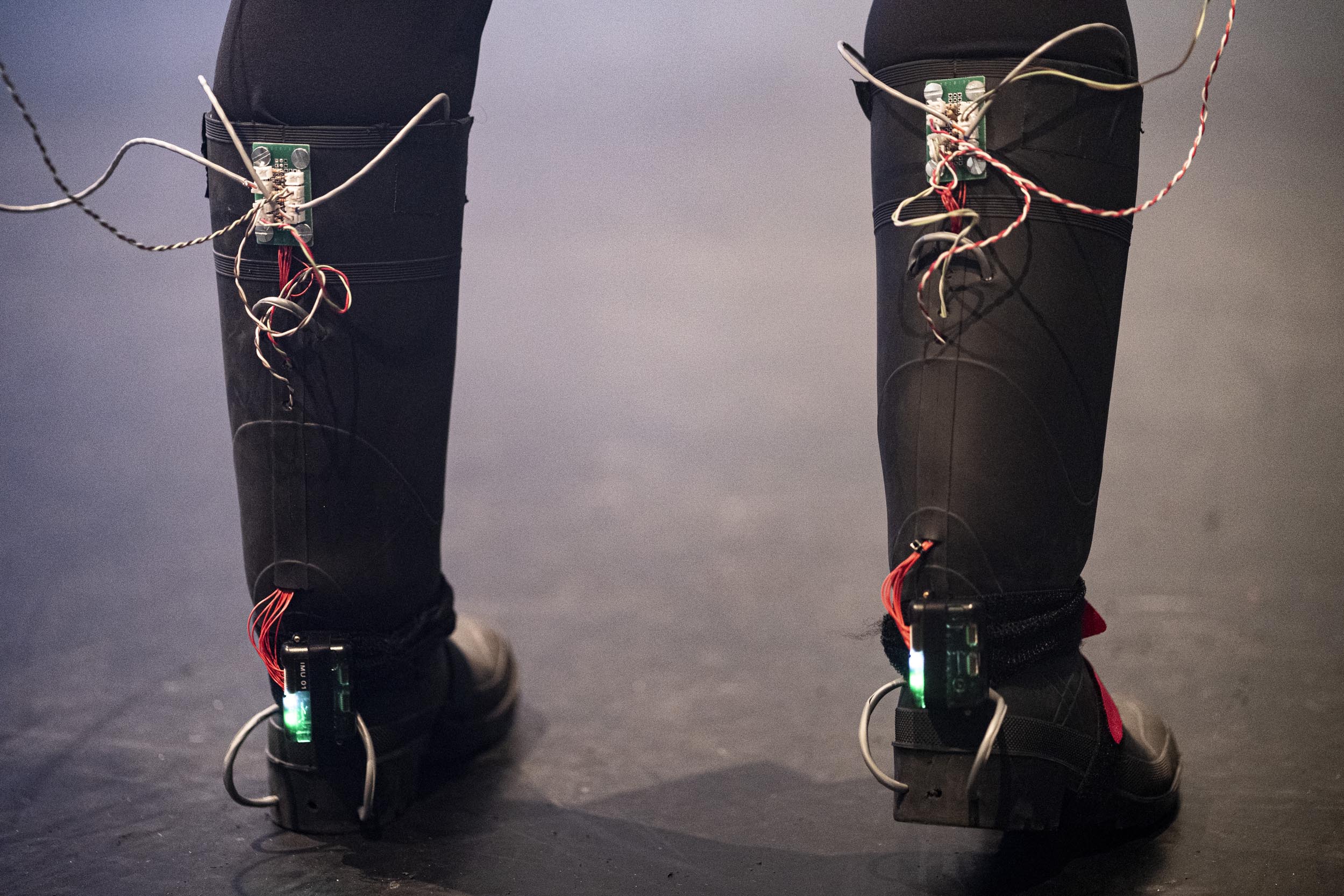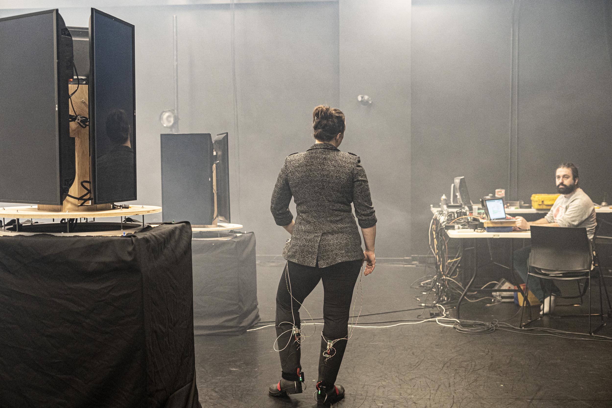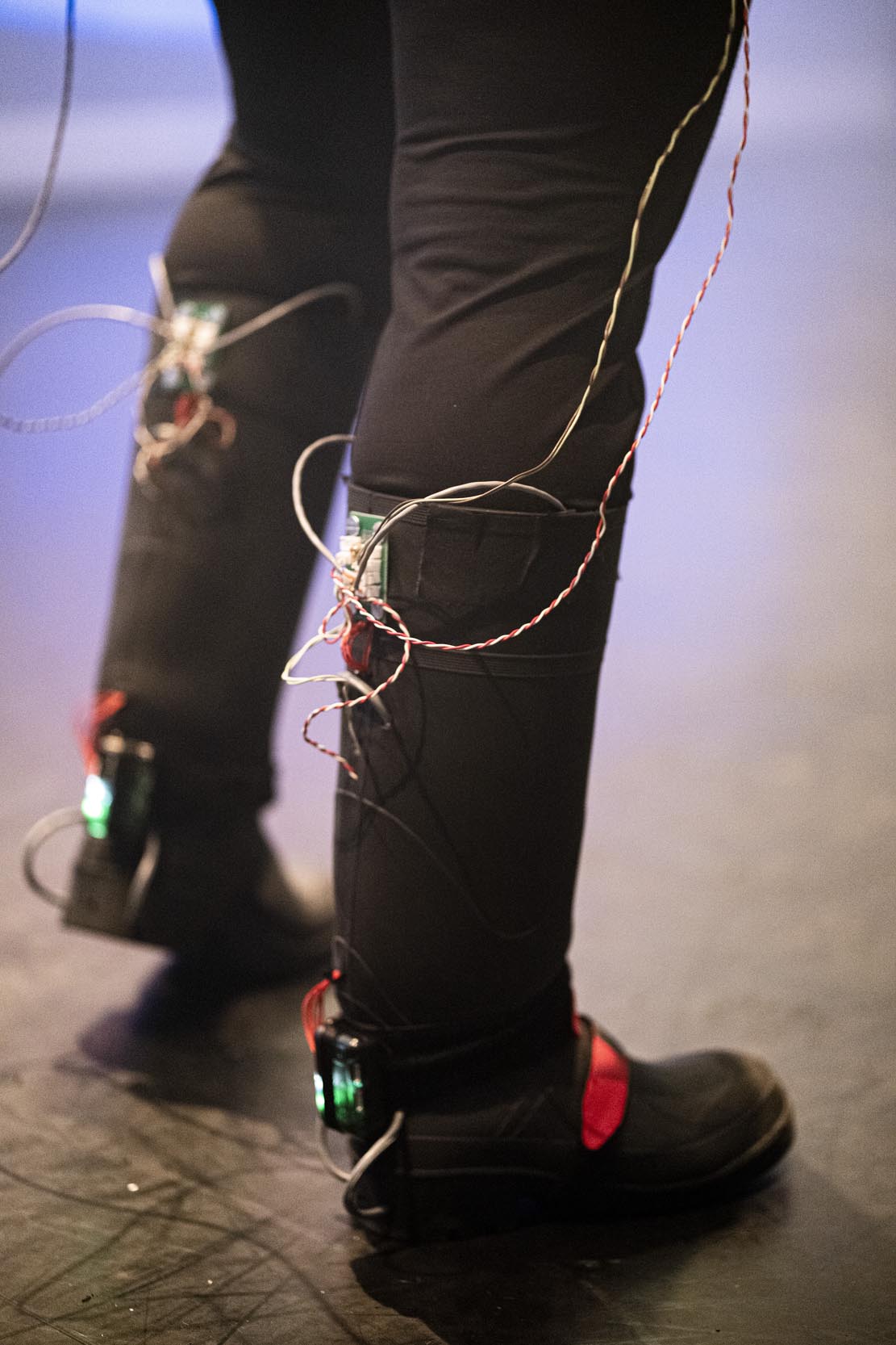 Louis-Robert Bouchard et Karine Chiasson explorent le dialogue possible entre la technologie et la danse gumboots. À l'aide de capteurs biométriques placés sur son corps, Karine Chiasson livre une performance de gumboots tout en étant connectée à un espace scénique parsemé d'équipement audiovisuel. Une rencontre surprenante entre l'art technologique et la danse!