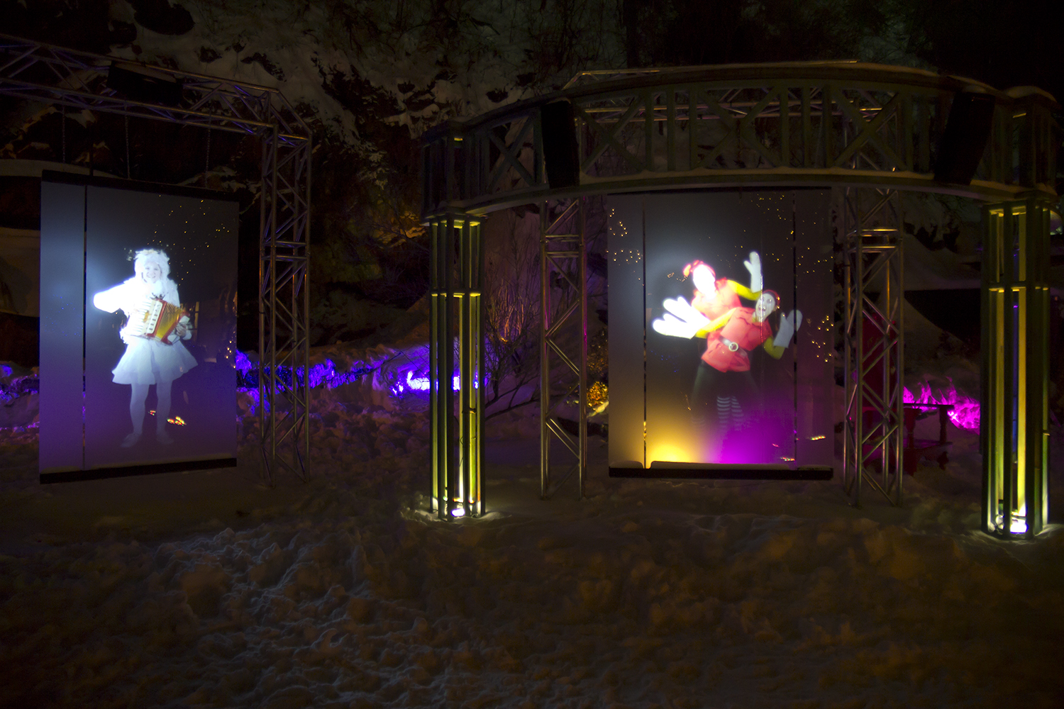 Grâce à un système ingénieux d'animation holographique, des personnages virtuels surprenants (jongleurs, clowns, et chef d'orchestre) interagissent avec la lumière et accueillent les flâneurs dans divers tableaux.
